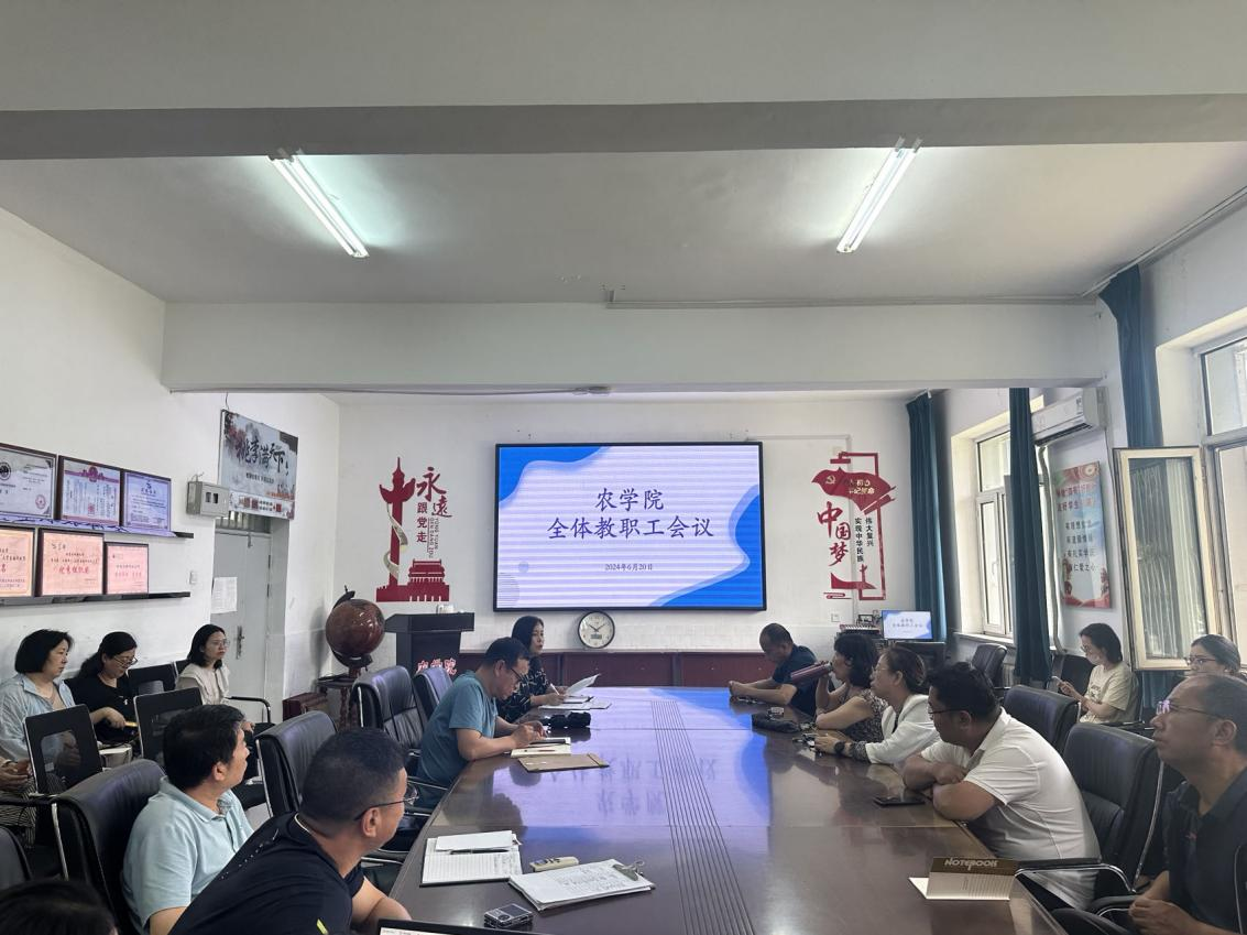 6月20日上午,农学院在农学楼110会议室召开全体教职工会议。学院领导班子成员、全体教职工参加会议。会议由学院党委书记张晓丽主持。